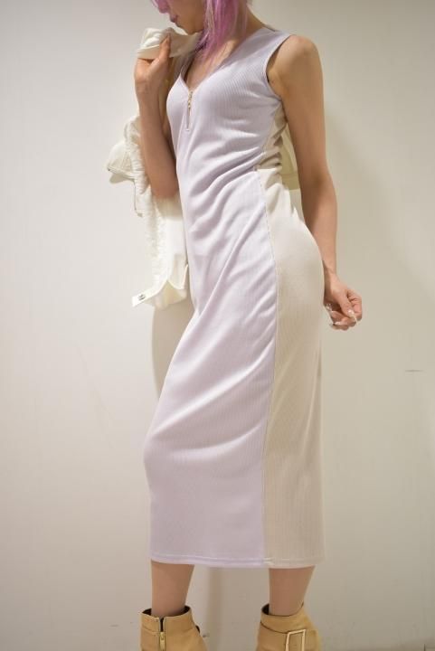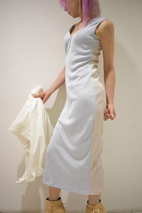 スリム効果抜群!gemmaのバイカラーマキシワンピース。ZIPで開閉自在な胸元、爽やかリブテレコ素材。日本製。Mサイズ。グレー/ホワイト。nano。